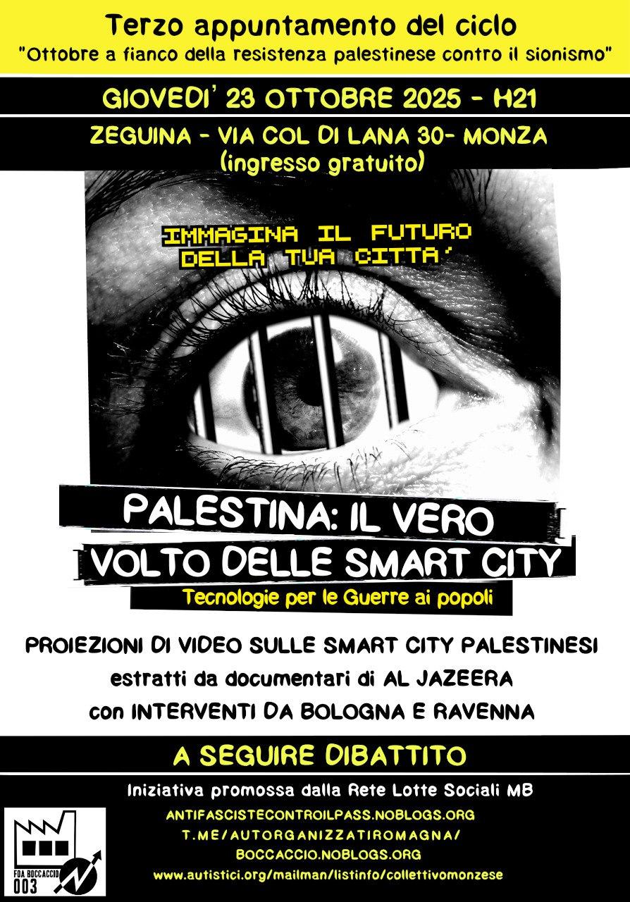 da Rete Lotte Sociali MB Smart City…oltre la facciata green ed ecosostenibile con cui viene rivestita si nasconde in realtà un dispositivo di sorveglianza, controllo e repressione capillare, fondamentale per qualsiasi stato per impedire gli attacchi dei nemici interni ed esterni. Mai come adesso che echi di guerra si odono sempre più vicini, risulta fondamentale per il dominio l’utilizzo della tecnologia per poter tracciare ogni movimento ed avere accesso alle informazioni degli abitanti, al fine di prevenire ed evitare ogni possibile rivolta ed ogni turbamento della pace sociale. Esattamente come in Israele, paese all’avanguardia nei sistemi di sorveglianza e di […]