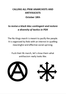 CALL TO ACTION: October 18th To help revive a black bloc contingent and restore a diversity of tactics to PDX. It’s been too long since the days where one hundred or more blocced homies showed up in the streets. It’s time we get back to our roots. As we know, the No Kings march is meant to pacify the people. It is organized by feds with an interest in quelling meaningful and effective social uprising. Fuck their lib march, let’s show them what antifascism really looks like!