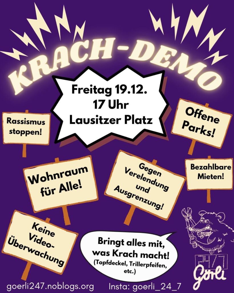 KRACH-DEMONSTRATION Freitag 19.12.25 | 17 Uhr Lausitzer Platz Offene Parks! Sie geben Millionen aus, um den Görli zu schließen. Aber ein Zaun hilft nicht gegen Armut, Obdachlosigkeit, Krankheit, Sucht, Verelendung und rassistische Ausgrenzung, sondern nimmt uns nur einen weiteren Raum. Deshalb: Unser Görli bleibt offen! Bezahlbare Mieten! Die Mieten sind viel zu hoch. Viel zu wenig bleibt zum Leben übrig. Wir zahlen, die Immo-bilienkonzerne und Eigentümer jubeln über hohe Profite. Das können und wollen wir uns nicht mehr leisten. Deshalb: Mieten deckeln & senken – Immobilienkonzerne vergesellschaften! Guter Wohnraum für alle! In den letzten Jahren hat sich die Zahl der […]