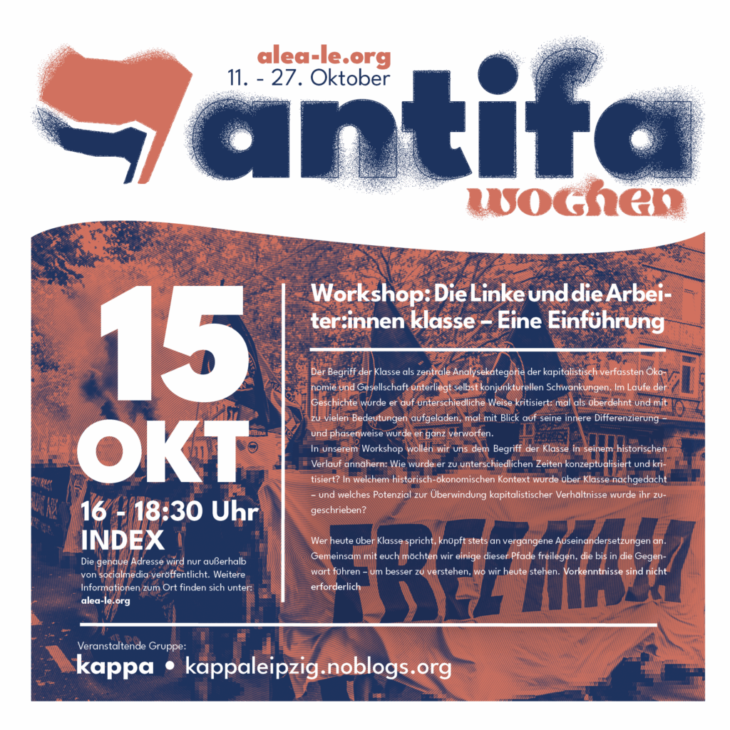 Es geht weiter im Programm der Antifawochen… Die Gruppe kappa bietet am 15. Oktober um 16:00 Uhr einem Workshop zum Thema “Die Linke und die Arbeiter:innenklasse” in index an. Kommt vorbei zur Arbeit am Begriff 😉 Aus dem Ankündigungstext: Der Begriff der Klasse als zentrale Analysekategorie der kapitalistisch verfassten Ökonomie und Gesellschaft unterliegt selbst konjunkturellen Schwankungen. Im Laufe der Geschichte wurde er auf unterschiedliche Weise kritisiert: mal als überdehnt und mit zu vielen Bedeutungen aufgeladen, mal mit Blick auf seine innere Differenzierung – und phasenweise wurde er ganz verworfen. In unserem Workshop wollen wir uns dem Begriff der Klasse in […]