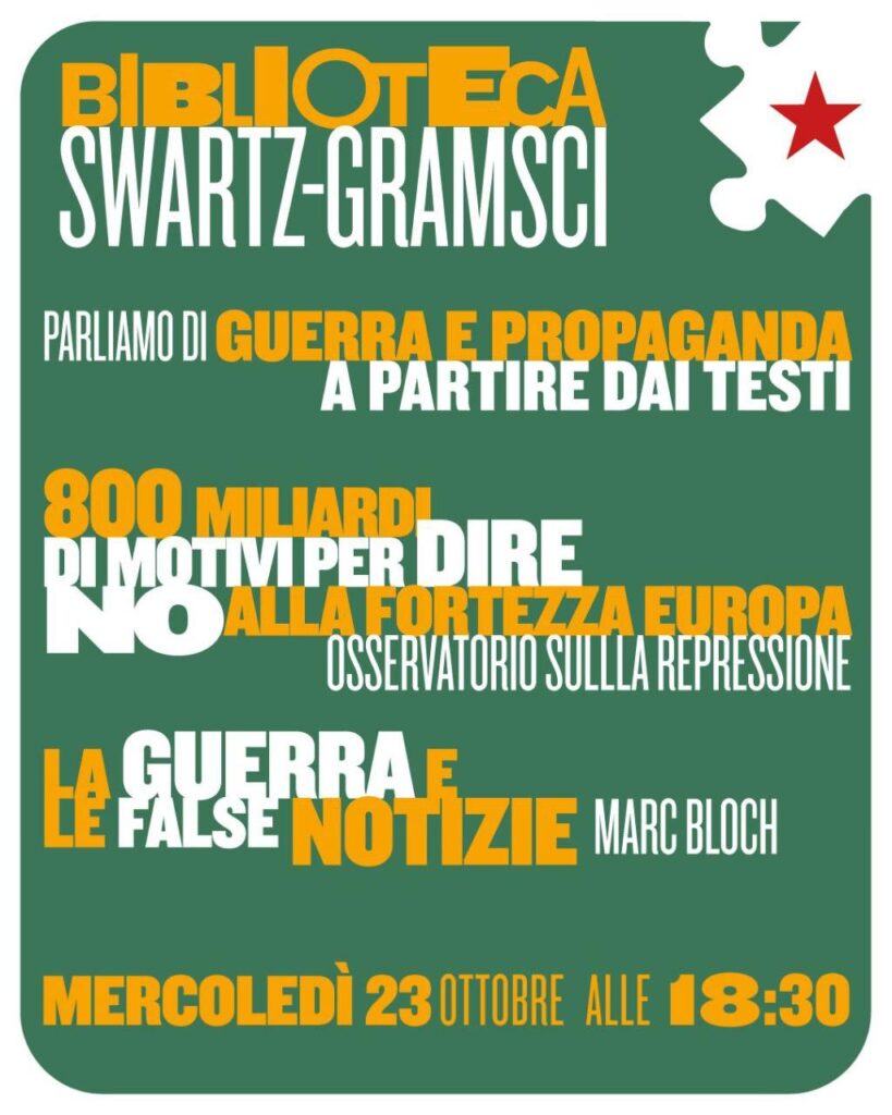 Alla Biblio Swartz-Gramsci, 𝐌𝐞𝐫𝐜𝐨𝐥𝐞𝐝𝐢̀ 𝟐𝟐 𝐚𝐥𝐥𝐞 𝟏𝟖:𝟑𝟎 “Guerra e propaganda” analizziamo i testi, ci confrontiamo sul tema. (LABPUZZLE - Bene Comune)