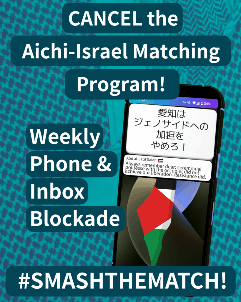 🚨📲 SMASH THE MATCH WEEK 11📲🚨 [INSTRUCTIONS ON SLIDES 4-6!] https://actionnetwork.org/letters/stm-prodrone-acompany-drop-the-aichi-israel-matching-program (NEW e-mail template! ∆) With over 2,355 e-mails sent and hundreds of comments posted on Aichi-related pages, the recent disruption and takeover of the Aichi Triennale, & the RESIGNATION of the corporate liaison connected to the Aichi-Israel Matching Program from the Triennale Committee, the SMASHTHEMATCH campaign just keeps going!! In our 11th week of action, we are coordinating with the #GROUNDF35 actions around the world, and hope to highlight the chilling truth that the international community still hasn’t fully appreciated: AICHI PREFECTURE IS ONE OF 3 PLACES IN THE…