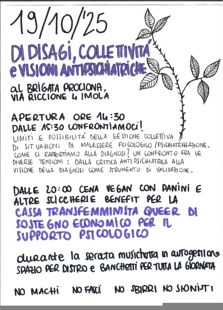 Diffondiamo: 19 ottobre 2025 al Brigata Prociona, via Riccione 4 (Imola) DI DISAGI, COLLETTIVITÀ E VISIONI ANTIPISICHIATRICHE Giornata di confronto e autofinanziamento per la cassa transfemminista queer di sostegno economico per il supporto psicologico. Apertura alle 14:30 Dalle 15:30, CONFRONTIAMOCI! Limiti e possibilità della gestione collettiva di situazioni di malessere psicologico/psichiatrizzazione. Come ci rapportiamo alla diagnosi? Un confronto fra le diverse tensioni: dalla critica antipsichiatrica alla visione della diagnosi come strumento di validazione. Dalle 20:00 cena vegan con panini e altre sciccherie benefit per la cassa transfemminista queer di sostegno economico per il supporto psicologico. Serata con musichetta in autogestione […]