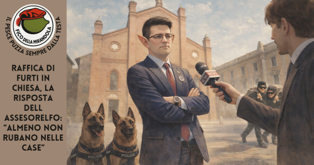 Furti in chiesa, offerte che spariscono, portafogli volatilizzati. Ma per l’Assesorlefo c’è anche un lato positivo: “Almeno non rubano nelle case”. A Mirandola si ruba pure in chiesa, ma guai a farsi prendere dal pessimismo. In una città dove ogni problema viene affrontato non risolvendolo, ma reinterpretandolo con sufficiente faccia tosta, anche i furti nei luoghi sacri possono diventare l’occasione per sfoderare una nuova perla di pensiero amministrativo creativo. La notizia è semplice: ladri in chiesa, soldi spariti, offerte volatilizzate, portafogli che prendono la via della redenzione al contrario. Ma il punto non è tanto il furto. Il punto, a […]