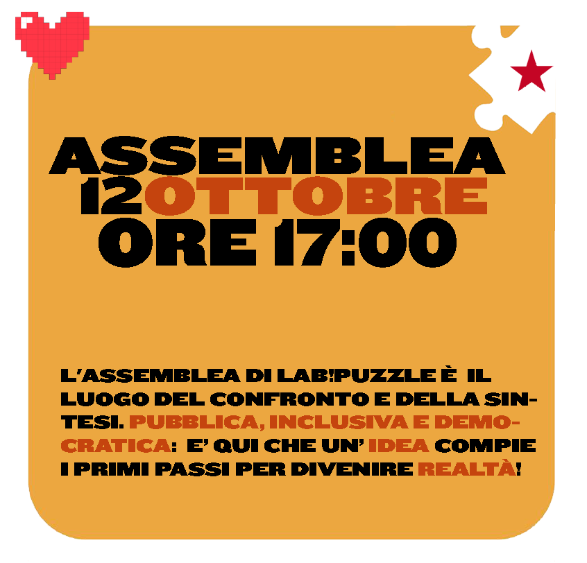 𝐋’𝐀𝐒𝐒𝐄𝐌𝐁𝐋𝐄𝐀L’assemblea di Lab!Puzzle è libera, pubblica, democratica, antifascista, antisessista e antirazzista, prerogative che riteniamo indispensabili per il vivere civile ed un confronto sano. Si tiene ogni prima domenica del mese alle ore 17:00, salvo quando diversamente specificato. 𝐎𝐑𝐃𝐈𝐍𝐄 𝐃𝐄𝐋 𝐆𝐈𝐎𝐑𝐍𝐎:L’odg si redige in mailing list ed è in continuo aggiornamento. Per iscriversi occorre partecipare ad almeno un’assemblea. considerazioni e riflessioni sul corteo del 4 ottobre e sulle mobilitazioni propalLotta per la casa: Lab!Puzzle è da sempre presente sul tema, con uno sportello abitativo e con un progetto abitativo. Vogliamo tornare a ragionarci/organizzarci insieme per ridare centralità al tema?FibonaccyDay: si terrà […]