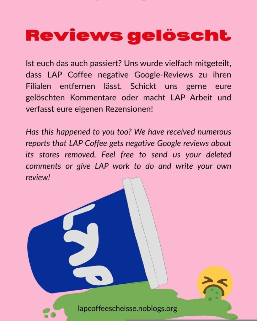 «Wir gehen dorthin, wo uns die Nachbarschaft nachweislich will», teilte Gründer und Geschäftsführer Ralph Hage auf Anfrage mit. Die Realität sieht anders aus: Kritik an Lap Coffee ist ganz offensichtlich nicht erwünscht und soll unsichtbar gemacht werden.
