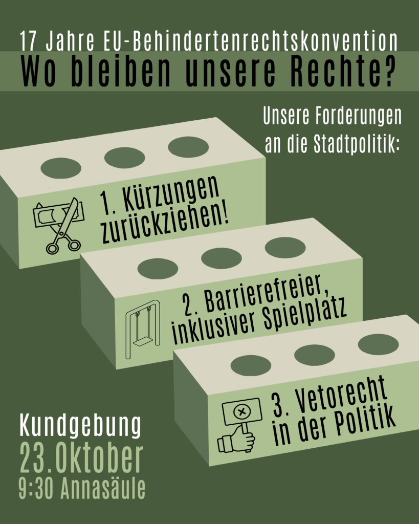 Einladung zur Kund-gebung Wann? Donnerstag, 23. OktoberWie viel Uhr? 09:30 UhrWo? Annasäule Innsbruck Im Jahr 2008 hat Österreich die UN-Behinderten-rechts-konvention ra-ti-fi-ziert.Das war am 26. Oktober 2008.Was heißt „ra-ti-fi-zieren“?Ratifizieren bedeutet: Ein Land unterschreibt ein wichtiges Abkommen und verpflichtet sich, es auch umzusetzen.Das heißt: Österreich hat damals versprochen, sich an die Regeln der UN-Behinderten-rechts-konvention zu halten.Was ist die UN-Behinderten-rechts-konvention?Das ist ein Vertrag sehr vieler Ländern. Der Vereinten Nationen (UN).In diesem Vertrag steht:Menschen mit Behinderungen haben die gleichen Rechte wie Menschen ohne Behinderungen.In allen Lebensbereichen – also in der Schule, in der Arbeit, in der Politik, in der Kultur und in der Freizeit […]