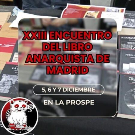 Nossa XXIII edição será celebrada nos dias 5, 6 e 7 de dezembro na Escola Popular de Prosperidad, “LA PROSPE” (Rua Luis Cabrera, 19). Continuamos trabalhando nas apresentações de livros, palestras e debates que nos fazem refletir sobre o mundo em que vivemos e a alternativa que propomos a partir do anarquismo. A atualidade é avassaladora: uma sociedade que pende cada vez mais para a direita, guerras ou os eufemisticamente chamados “conflitos” (mais de 50) e genocídios transmitidos ao vivo na televisão e nas redes sociais, anarquistas detidos em diversos países por erguerem sua voz contra as barbáries cometidas tanto por […]