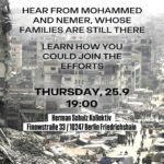 ⚲ 19:00 | Herman Schulz Kollektiv, Finowstraße 33, 10247 Berlin-Friedrichshain Join us to fundraise for immediate relief and to support getting their families to safety. Learn how you could join the efforts. 🗓️ Thursday 25.9 🕖 19:00 📍 Herman-Schulz cafe, Finowstraße 33
