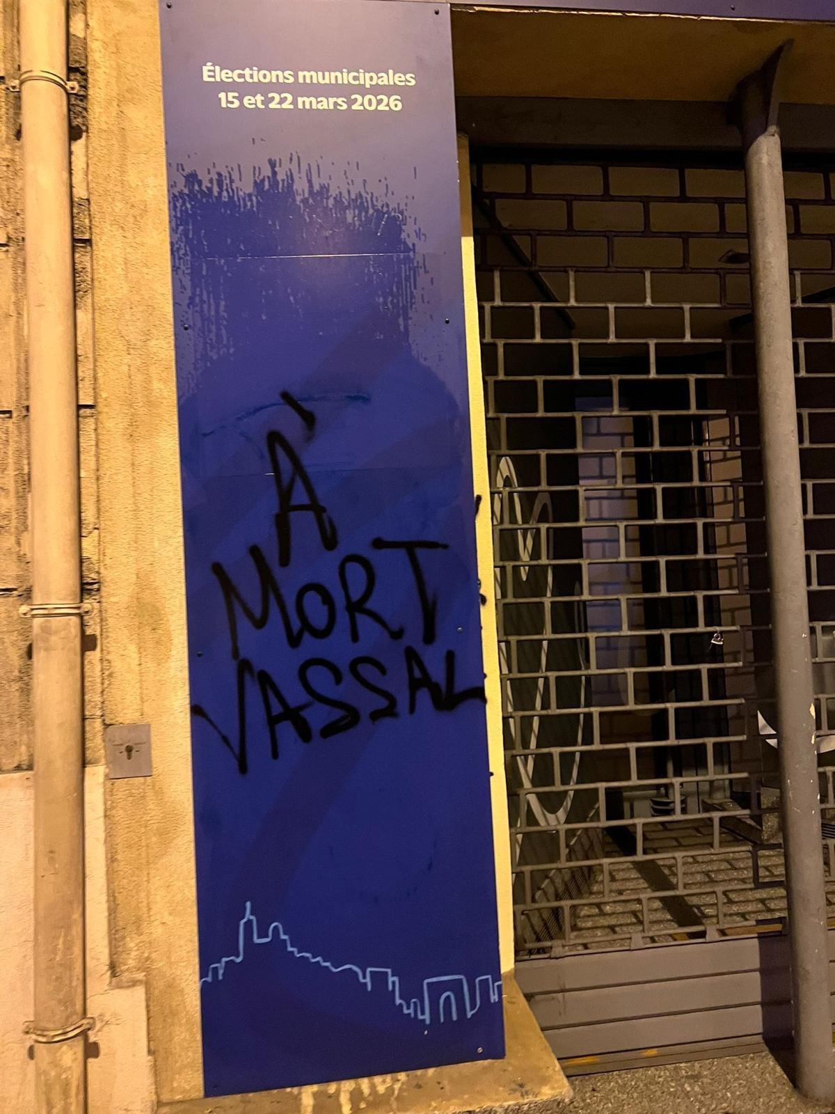 extraits d’Actu Marseille / mardi 24 février 2026 […] Dans la nuit de lundi à ce mardi 24 février 2026, les mots « À mort Vassal » ont été tagués sur les locaux de la candidate de la droite et du centre [Martine Vassal, LR, présidente de la Métropole Aix-Marseille-Provence et du Département des Bouches-du-Rhône ; NdAtt.] pour les élections municipales à Marseille, a-t-elle dénoncé. L’élue, qui avait provoqué un tollé en reprenant comme ses valeurs « le mérite, le travail, la famille, la patrie », dont le dernier triptyque pétainiste, se dit victime de « l’ultra-gauche ». […]