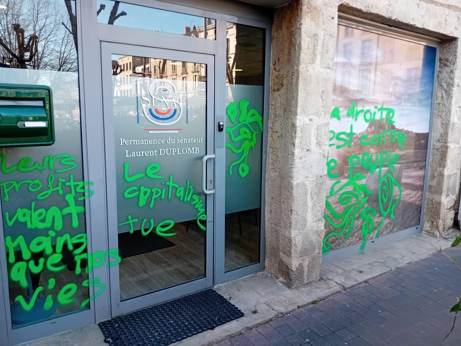 Le Progrès / jeudi 26 février 2026 Dans la nuit de mercredi à jeudi, la permanence du sénateur Laurent Duplomb (Les Républicains) a été taguée au Puy-en-Velay à l’aide de peinture verte. Sur les fenêtres, plusieurs slogans, comme « Leurs profits valent moins que nos vies » ou « Le capitalisme tue ». Une référence aux propositions de loi du sénateur altiligérien déposées cet été et début février visant à « lever les contraintes à l’exercice du métier d’agriculteur ».