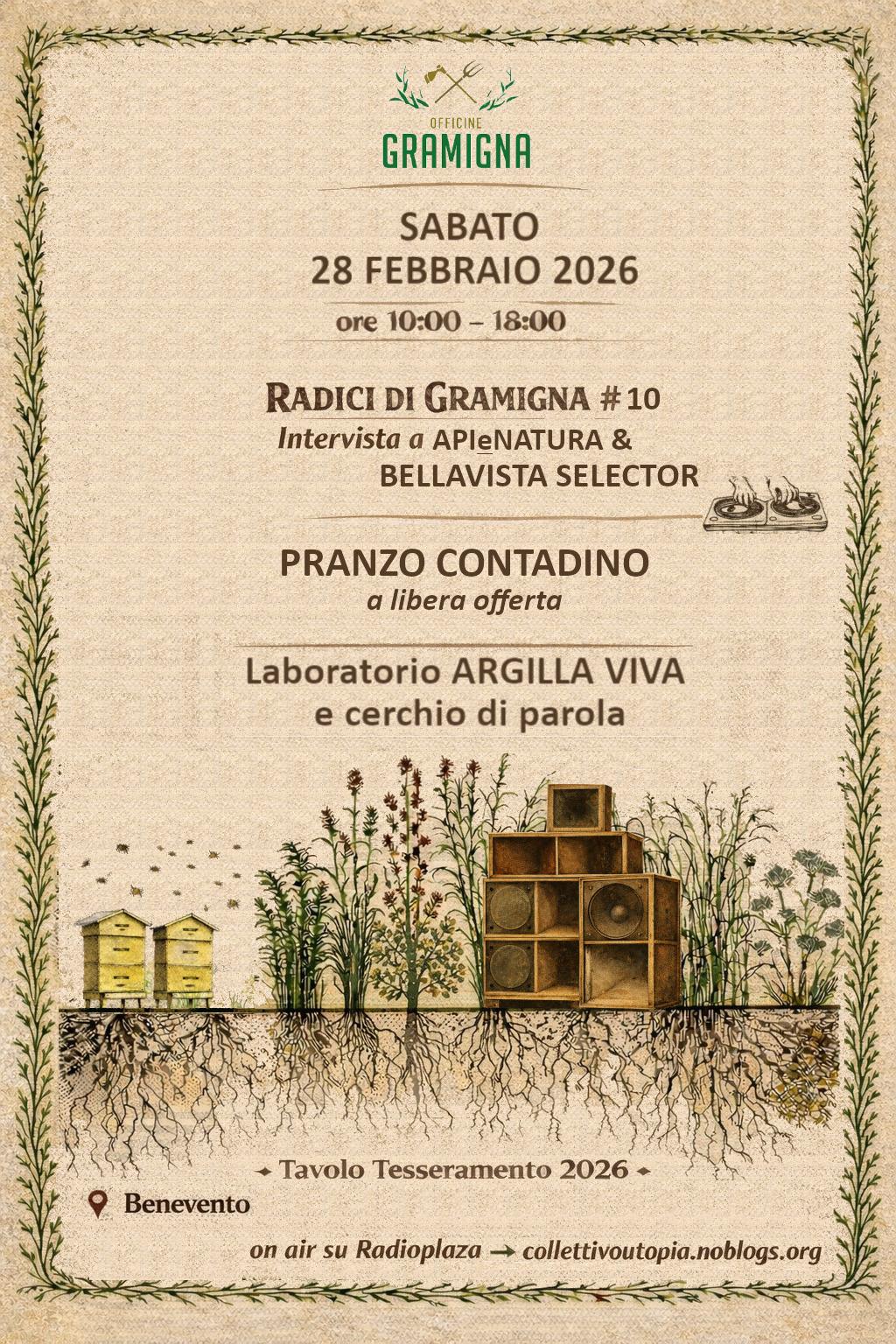 Dal vivo a casa gramigna e sulle ondeggianti frequenze di radio plaza RADICI DI GRAMIGNA #10 aperiodico radiofonico noomade su ritmo terra e liberta’: storie di vita e resistenza contadina, antidoti magici al virus del potere e musica viva. Nel pignato di questa giornata: RACC/ORTI , intervistiamo due amici apicoltrici e cultori di comunita’, Api e Natura, che si racconteranno ai microfoni della radio descrivendo nell’intimo la loro scelta di vita e professionale e la loro missione educativa; Bellavista selector aka Maestro Jamil è l ospite “dubplate” di SOUND SYSTEM TALES: abbiamo perso il conto delle cose da chiedergli e […]