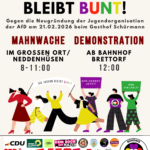 Aktionsbündnis Landkreis Oldenburg (AbLakOl) schreibt: „Das „Bündnis Buntes Brettorf“ ruft zur Demonstration gegen die Neugründung der Jugendorganisation der AfD beim Gasthof Schürmann in Brettorf auf. Der Demonstrationszug beginnt um 12:00 Uhr am Bahnhof und führt zum großen Ort, dort findet eine Zwischenkundgebung statt. Abschließende Worte beenden die Demonstration am Bahnhof um 15:00 Uhr. Anmelder und Anwohner Matthias Lux vom „Bündnis Buntes Brettorf“: „Wie bei den vergangenen Demonstrationen laden wir weiterhin alle Menschen in der Region und ganz Niedersachsen ein sich an den Versammlungen zu beteiligen und Haltung zu zeigen. Unser Dorf ist eine offene Gemeinschaft und hat Platz für alle…
