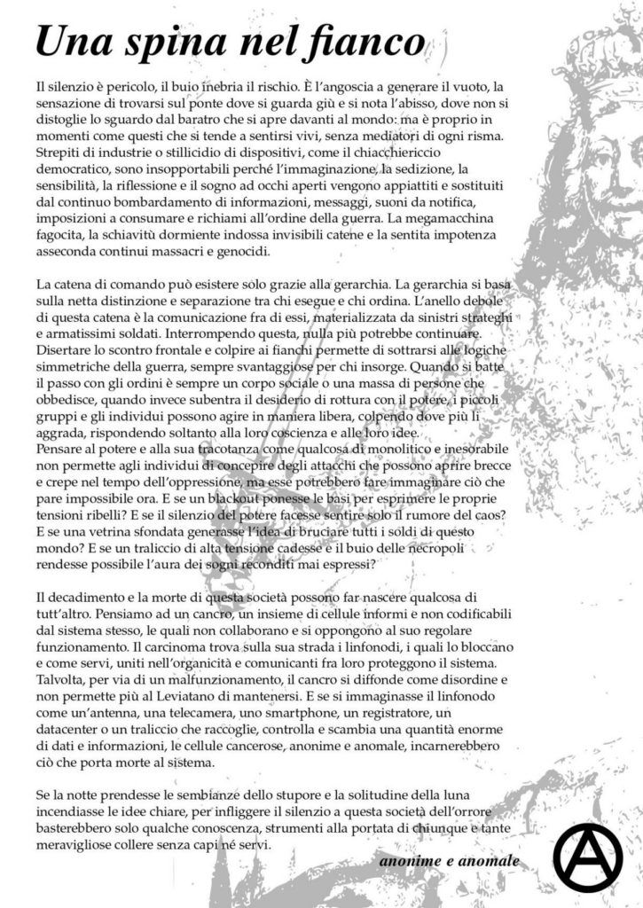 “LE ROSE, DOVE SONO LE ROSE?”Cronache e considerazioni sulle manifestazioni di affetto per Sara e Sandro e sull’antimafia come dispositivo di contro insurrezione Nella notte tra giovedì 19 e venerdì 20 marzo un forte boato ha scosso i quartieri di Roma-est a ridosso del parco degli acquedotti, all’interno del parco un esplosione ha fatto crollare una parte di un casale abbandonato. L’esplosione e il crollo hanno ucciso due nostri compagni Sara e Sandro. La loro estrema coerenza tra idea ed azione li ha condotti a rischiare e a superare il limite tra la vita e la morte. Dopo questo fatto […]
