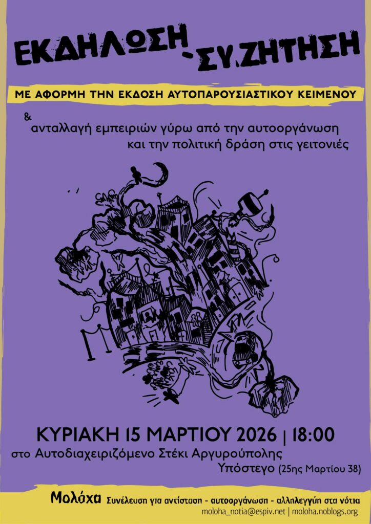 ΕΚΔΗΛΩΣΗ – ΣΥΖΗΤΗΣΗμε αφορμή την έκδοση αυτοπαρουσιαστικού κειμένου &ανταλλαγή εμπειριών γύρω από την αυτοοργάνωση και την πολιτική δράση στις γειτονιές ΚΥΡΙΑΚΗ 15 ΜΑΡΤΙΟΥ 2026 στις 18:00 στο Αυτοδιαχειριζόμενο Στέκι Αργυρούπολης Υπόστεγο (25ης Μαρτίου 38) Το αυτοπαρουσιαστικό της συνέλευσης μπορεί να βρεθεί online εδώ ενώ σε έντυπη μορφή διατίθεται στα ανοίγματα του στεκιού Μολόχα – Συνέλευση για αντίσταση, αυτοοργάνωση, αλληλεγγύη στα νότιαmoloha_notia@espiv.net | moloha.noblogs.org
