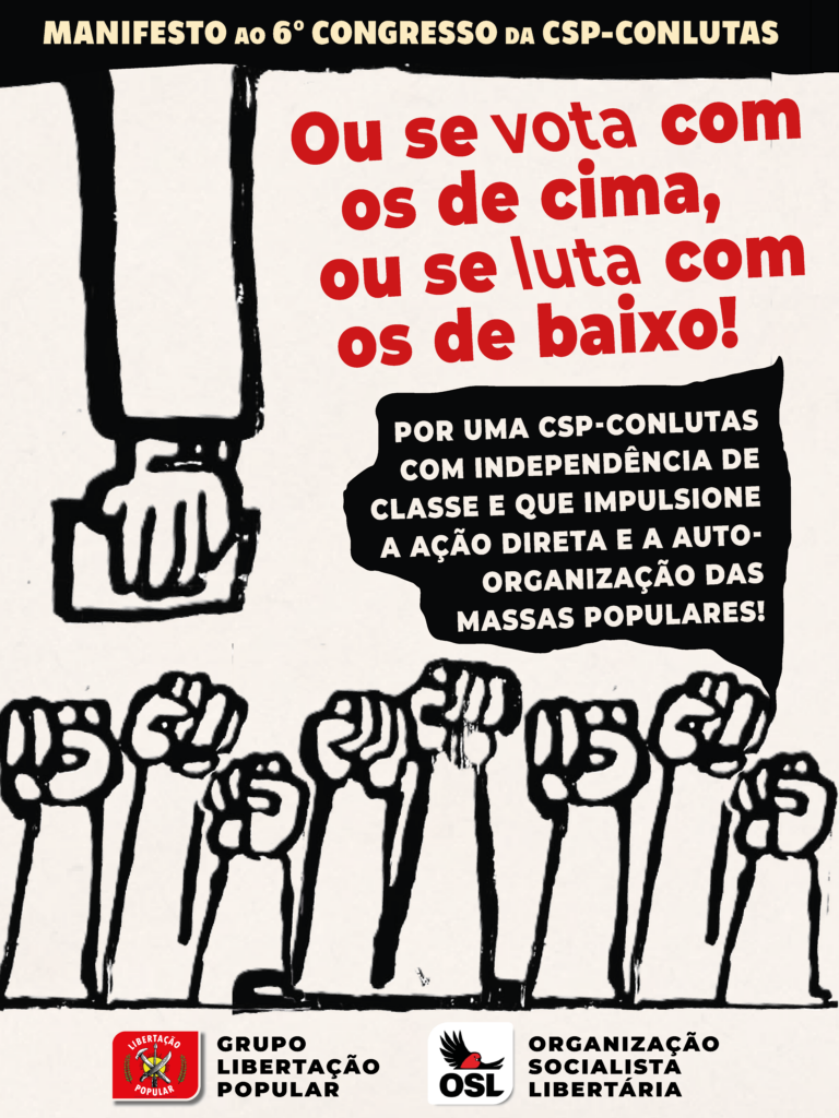 Leia e baixe o Manifesto em PDF Ou se vota com os de cima, ou se luta com os de baixo! Por uma CSP-Conlutas com independência de classe e que impulsione a ação direta e a auto-organização das massas populares! GRUPO LIBERTAÇÃO POPULAR (GLP) ORGANIZAÇÃO SOCIALISTA LIBERTÁRIA (OSL) A conjuntura brasileira vai acelerando as lições e contradições para o movimento de massas, sindical e popular. A opção estratégica que prioriza a disputa eleitoral para a gestão do Estado, hegemônica na esquerda desde a redemocratização, gerou ao longo das últimas décadas graves desvios e crises nas organizações de trabalhadores, afetando a […]