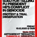 ⚲ Amtsgericht Tiergarten, Turmstraße_91 Join the support rally on 17 December at 1 pm! TRIAL AT ROOM A500! Join the trial support or the support rally! After multiple failed attempts to criminalize the popular slogan "From the River to the Sea, Palestine will be Free", the Berlin justice system is going all out! More than 10 hearings have taken place until on Monday 15 December, the judge rushed the lawyers into reading their closing arguments. This means that the verdict might come this Wednesday, a verdict that can be used as a guideline for criminalization for thousands of cases! Whatever […]