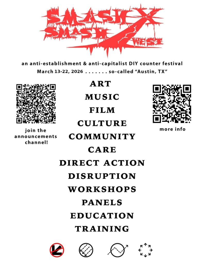 As SmashXSmashWest enters its 3rd year, we’re growing into our own dedicated website space! This website is still under development as we get ready to announce SmashXSmashWest 2026 and build out the infrastructure for it. Have patience and check back here when you can, or follow us on Instagram @smashxsmashwest Save the date, SmashXSmashWest will be back from March 13-22, 2026. More details coming soon! You can still find materials from previous years of SmashXSmashWest over at Austin Autonomedia
