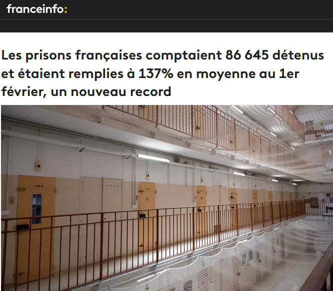 Les prisons françaises comptaient 86 645 détenus et étaient remplies à 137% en moyenne au 1er février, un nouveau record (Anti.MÉDIA)