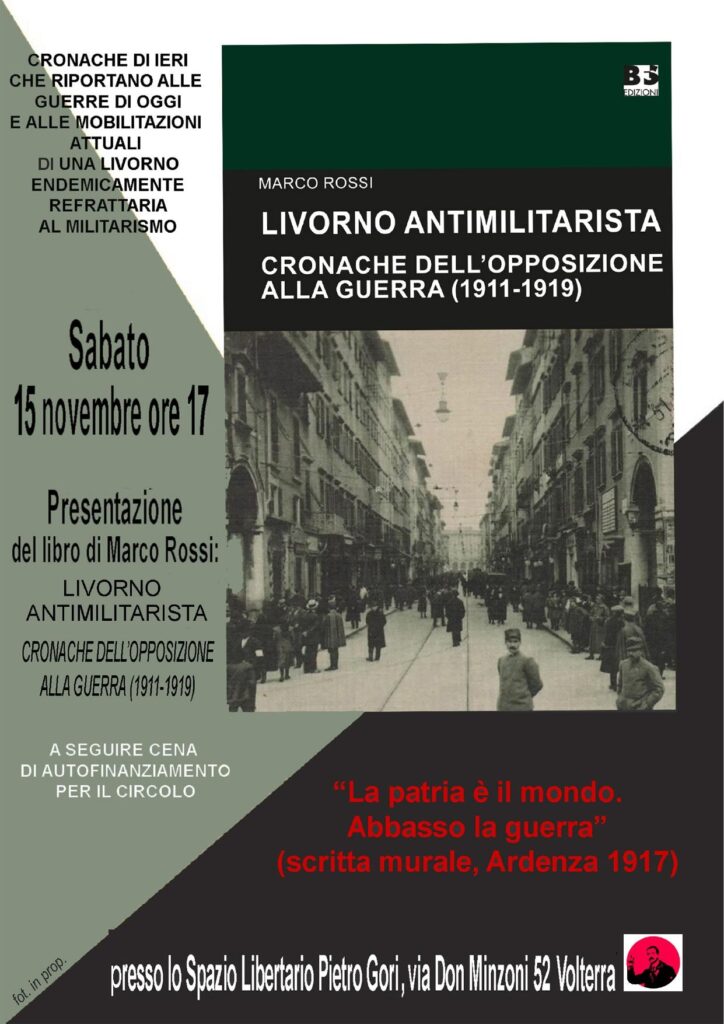 Sabato 15 novembre 2025, dalle ore 17, presso la nostra sede presentiamo il libro di Marco Rossi LIVORNO ANTIMILITARISTA – Cronache dell’opposizione alla guerra (1911-1919) “CRONACHE DI IERI CHE RIPORTANO ALLE GUERRE DI OGGI E ALLE MOBILITAZIONI ATTUALI DI UNA LIVORNO ENDEMICAMENTE REFRATTARIA AL MILITARISMO” A seguire cena di autofinanziamento per il circolo Pietro Gori. Tutte invitate, tutti invitati. “La patria è il mondo. Abbasso la guerra” (scritta murale, Ardenza 1917)