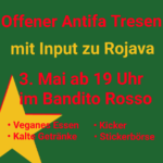 *english translation below* Samstag, 03.05.2025 | ab 19:00 Uhr | Bandito Rosso*, Lottumstraße 10a, 10119 Berlin Um etwa 20 Uhr gibt es einen Vortrag von Ronahi zu Rojava. Außerdem: veganes Essen kalte Getränke Tischkicker Stickerbörse *leider nicht barrierearm (Treppe mit 7 Stufen am Eingang: Außen-Klingel betätigen, wenn ihr Unterstützung braucht!; einzelne Stufen im Innen-Bereich; Holzstühle mit Rückenlehne und ein Sofa; abgetrennter Rauch-Raum, Rückzugs-Raum; englische Flüster-Übersetzungen auf Anfrage) Unsere Mail-Adresse: oat-berlin@riseup.net Unser Blog: oatberlin.noblogs.org ***english*** OPEN ANTIFA BAR Saturday, May 3th 2025 | from 7 p.m. | Bandito Rosso*, Lottumstraße 10a, 10119 Berlin At about 8pm there […]