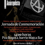1° DE MAYO ANARQUISTA JORNADA DE CONMEMORACION Por un mayo negro y combativo Plaza Bogotá – Barrio Matta Sur El primero de mayo para lxs anarquistas tiene un peso y una relevancia que, más allá de su fuerte arraigo histórico, se actualiza permanentemente en una lucha antiautoritaria que sabe entender que la explotación y el poder deben ser enfrentados en todas sus formas y desde todas las formas posibles. Conmemorar para lxs anarquistas conlleva hacer de la memoria un arma que nos permite traer al presente las luchas ácratas históricas con el fin de intensificar y cualificar las batallas que […]