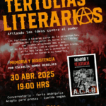 TERTULIAS LITERARIAS Afilando las ideas contra el Poder Es de conocimiento público el asesinato por parte de la policía de un pequeño y una joven hincha de Colo-Colo hace unas semanas atrás. Hechos que no son aislados y de los cuales no quedamos indiferentes más allá del fútbol, colores y pasiones, ya que aquel es el actuar propio de esa nefasta institución. En esa línea, reafirmando la importancia de la memoria y de que esta sea impulsada por compañerxs y no desde la academia o alguna historia oficial. Lxs dejamos invitadxs a recordar a nuestrxs muertxs, a conversar y tensionar […]