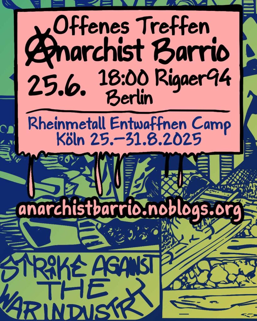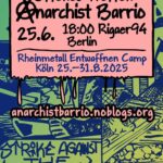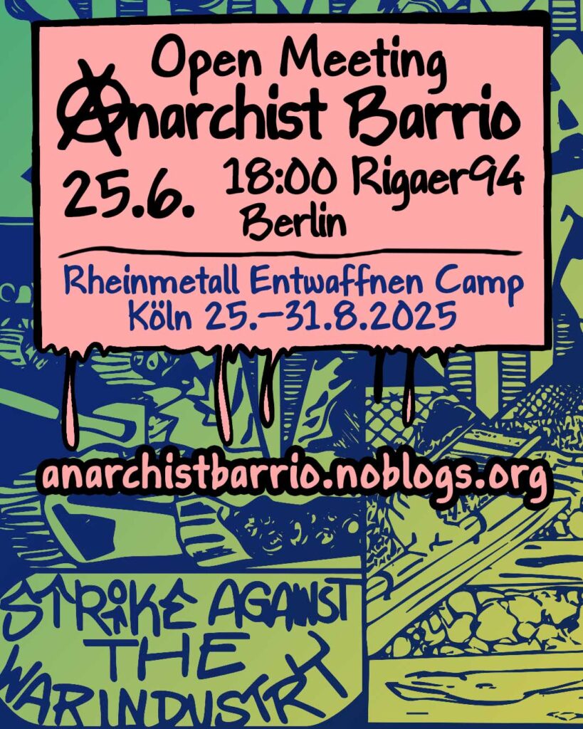⚲ 18:00 | R94, Rigaerstr.94, Berlin-Friedrichshain 👉 Come along, get involved, bring your own ideas. 📝 Topics a.o.: mobi actions, mobi-event + soli evening on 5 July, germany-wide and international networking, planning of the Barrio We invite you – groups and individuals – to a meeting to plan a space for the anarchist and autonomous part of the movement at the Rheinmetall Entwaffnen Camp. The aim is to come together to create connections, to hold discussions and do actions – mainly but not only around the topic of war and genocide. ℹ️ Call: https://anarchistbarrio.noblogs.org