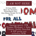 I AM NOT HERE 18 June 2025 Haus der Statistik / Pionierfläche Otto Otto-Braun-Straße 70-72 Berlin Opening speech 7PM Slogans Workspot + Splav Theater (Serhiy Demchuk & ZIP group root orchestra) 8PM Babi Badalov, Georgy, Antero Jalomies, Komitee 19 January Berlin, Siniša Labrović, Tanja Ostojić, David Ter-Oganyan Organized by Rena Rädle & Vladan Jeremić in collaboration with Mensch Raum Land, Counterpoints Arts and Refugee Week Berlin. Refugee Week Berlin: I AM NOT HERE – Pop-up exhibition