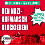 Antifaschismus bleibt notwendig! Am Samstag, den 26.04.2025 versammeln sich deutschlandweit wieder Querdenken-Reste gemischt mit Neonazis unter dem Motto “Gemeinsam für Deutschland”. Diesem Versuch der teils sehr jungen Faschogruppen, sich öffentlich zu zeigen, wollen wir uns konsequent entgegenstellen! Deswegen möchten wir gemeinsam mit euch nach Reutlingen fahren, um uns dort an den Gegenprotesten zu beteiligen. Hierfür treffen wir uns um 11:15 Uhr in Ulm vor dem Subway am Hauptbahnhof. Mehr Infos zum Gegenprotest findet ihr beim Bündnis Gemeinsam und Solidarisch gegen Rechts – Reutlingen und Tübingen