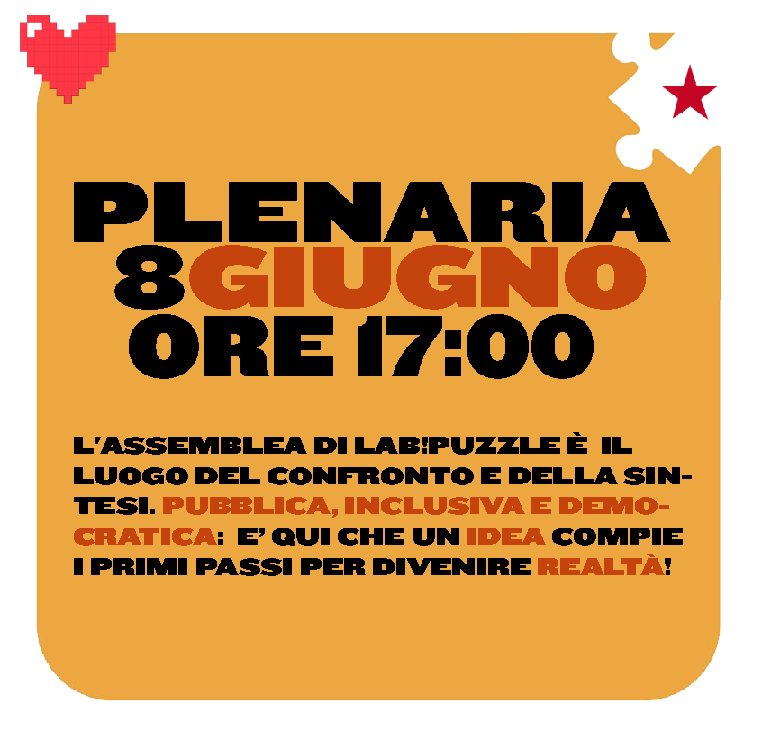 ✏️ 𝐎𝐑𝐃𝐈𝐍𝐄 𝐃𝐄𝐋 𝐆𝐈𝐎𝐑𝐍𝐎:L’odg si redige in mailing list ed è in continuo aggiornamento. Per iscriversi occorre partecipare ad almeno un’assemblea.📍…👉𝐄̀ 𝐋𝐀 𝐏𝐑𝐈𝐌𝐀 𝐕𝐎𝐋𝐓𝐀 𝐂𝐇𝐄 𝐕𝐈𝐄𝐍𝐈?È riservato uno spazio all’interno di ogni assemblea per le presentazioni, per raccontarsi, per dire la propria.👉𝐏𝐮𝐨𝐢 𝐏𝐀𝐑𝐓𝐄𝐂𝐈𝐏𝐀𝐑𝐄 𝐚𝐧𝐜𝐡𝐞 𝐎𝐍𝐋𝐈𝐍𝐄Qui il link https://meet.jit.si/assemblea_labpuzzle🏠𝐋'𝐀𝐒𝐒𝐄𝐌𝐁𝐋𝐄𝐀L’assemblea di Lab!Puzzle è libera, pubblica, democratica, antifascista, antisessista e antirazzista, prerogative che riteniamo indispensabili per il vivere civile ed un confronto sano. Si tiene ogni prima domenica del mese alle ore 17:00, salvo quando diversamente specificato.📖𝐚𝐫𝐜𝐡𝐢𝐯𝐨 𝐑𝐄𝐏𝐎𝐑𝐓https://labpuzzle.noblogs.org/post/category/report/📧 Per iscriversi alla 𝐧𝐞𝐰𝐬𝐥𝐞𝐭𝐭𝐞𝐫: http://urly.it/3af20🔗 il nostro canale 𝐓𝐞𝐥𝐞𝐠𝐫𝐚𝐦: https://t.me/labpuzzle🌍 il nostro 𝐬𝐢𝐭𝐨 𝐰𝐞𝐛: https://labpuzzle.noblogs.org💰Siamo […]