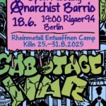 ⚲ 19:00 | R94, Rigaer Straße 94, Berlin-Friedrichshain Come along, get involved, bring your own ideas. Topics a.o.: mobi event, mobi actions, networking also beyond Berlin We invite you – groups and individuals – to a meeting to plan a space for the anarchist and autonomous part of the movement at the Rheinmetall Entwaffnen Camp. The aim is to come together to create connections, to hold discussions and do actions – mainly but not only around the topic of war and genocide. Call: https://anarchistbarrio.noblogs.org "Anarchists in the Anti-War-Movement! Spread anarchist ideas among the people! Against war, against colonialism, against exploitation, […]