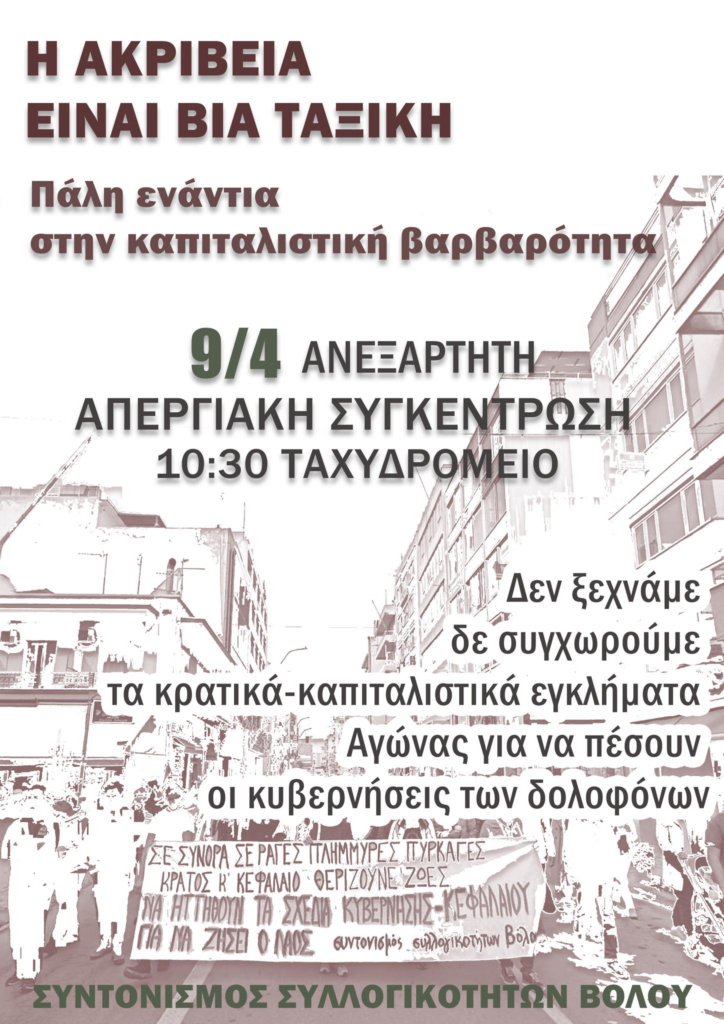 Ανεξάρτητη ταξική συγκέντρωση στο Ταχυδρομείο (Δημητριάδος και Αγ. Νικολάου) στις 10:30 ΟΥΤΕ ΒΗΜΑ ΠΙΣΩ ΑΠΟ ΤΙΣ ΑΝΑΓΚΕΣ ΚΑΙ ΤΑ ΔΙΚΑΙΩΜΑΤΑ ΜΑΣ Κάτω οι κυβερνήσεις των δολοφόνων, των ιδιωτικοποιήσεων, της φτώχειας, της πείνας και του πολέμου! Στις 9 Απρίλη κηρύχτηκε νέα γενική απεργία με κεντρικό αίτημα την επαναφορά του 13ου & 14ου μισθού καθώς και πραγματικές αυξήσεις των μισθών. Στις 6 Ιούνη διεξάγεται πρότυπη δίκη στο ΣΤΕ που θα κρίνει ακόμη μια φορά αν θα επανέλθουν δώρα και επιδόματα στο δημόσιο τομέα και αν θα επανέλθουν εργασιακά δικαιώματα που κατακτήθηκαν ένα αιώνα πριν και περικόπηκαν για τη σωτηρία του κεφαλαίου μετά…