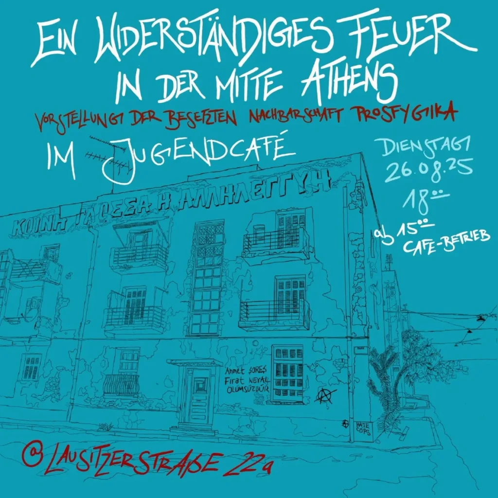 *** english below *** Dienstag 26. August, 18 UhrIm JugendcafeLausitzerstraße 22aAb 15 Uhr Café-Betrieb Seit über 15 Jahren existiert Europas größter Squat – im Herzen Athens. Das “Plenum der besetzten Gemeinschaft Prosfygika” zeigt, wie kollektive Selbstorganisierung auch in immer prekärer werdenden Zeiten möglich sein kann. Über 400 Menschen leben dort. Prosfygika hat es geschafft, eine sich als politisch zusammengehörig verstehende Nachbarschaft zu bilden, die aus zahlreichen besetzten Wohnungen und gemeinschaftlich organisierten Strukturen besteht, welche auf den Bedürfnissen der Bewohner:innen basieren. Gleichzeitig gestaltet sie lokalen und internationalen Kämpfe mit. Wir sprechen über die aktuelle Bedrohungslage, wie wir die Community unterstützen können […]