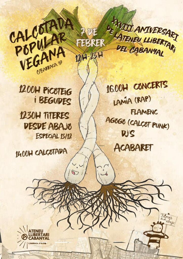 🥬🔥❤️🔥🥬 5.ª CALÇOTADA POPULAR VEGANA DE L’ATENEU LLIBERTARI DEL CABANYAL 🥬🔥❤️🔥🥬 📣Tornen les calçotades de l’Ateneu Llibertari del Cabanyal!!! 🎂 Pel nostre XXVIII aniversari, per fer front a despeses per a millorar l’espai, pagar els gastos repressius d’uni veïni del barri afectadi per l’especulació i gentrificació del barri i per a sostindre projectes del propi espai. 🎊 12:00 Obertura de portes i benvinguda 🧚 12:30 Especial 13/12 de Títeres desde Abajo 🥬 14:00 Calçotada Popular Vegana I a partir de les 16:00 tindrem: 💃 Espectacle Falmenco 🎤 LAMIA (RAP) 🎸 AGOGO (Calçot PUNK) 🎛️ PunxadETA de DJs 🐞 Lis Anarquistes […]