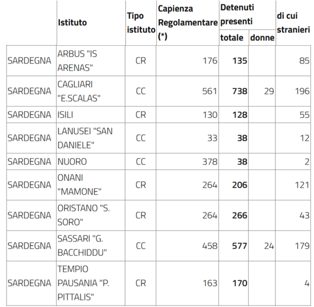 Da notare che quasi tutte le carceri sono al limite della capienza o la superano. Si noti che a Cagliari ci sono quasi 200 prigionieri in più (questo spiega l’elevato numero di prigionieri per cella di cui spesso parla Paolo nelle sue lettere) e a Sassari 120 in più. Solo Nuoro è praticamente vuoto perchè viene preparato per essere una delle galere dedicate solo allla tortura di Stato del 41 bis