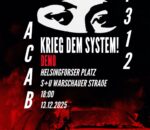 Am 13.12. (ACAB-Tag!) tragen wir unsere Wut auf die Straßen – mit Bannern, lauter Stimme, und allem was euch noch so einfällt – gegen das gesamte System von Polizei, Knast, Grenzen und gewaltsamer Dominanz. Die Polizei ist einer der zentralen Mechanismen eines Systems, das die Herrschaft von Staat und Kapital sowie ihren Profiteur*innen gegen die Leben aller Anderen und des Planeten absichert. ACAB meint mehr als die Polizei: Es meint auch den Militarismus, die Bundeswehr, das Gefängnissystem, Grenzregime, das ganze System, seine zutiefst faschistische Struktur, seinen rassistischen Konsens, seine patriarchale Kontinuität und seine koloniale Geschichte und Aktualität. ACAB bedeutet auch…