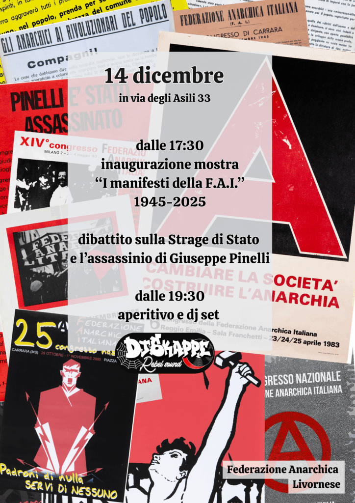14 dicembrealla FAL in Via delgi Asili 33, Livorno dalle 17:30 Inaugurazione della mostra“I manifesti della F.A.I.”1945-2025 Dibattito sulla Strage di Stato e l’assassinio di Giuseppe Pinelli dalle 19:30aperitivo e dj setcon DJ SKAPPERebel Sound