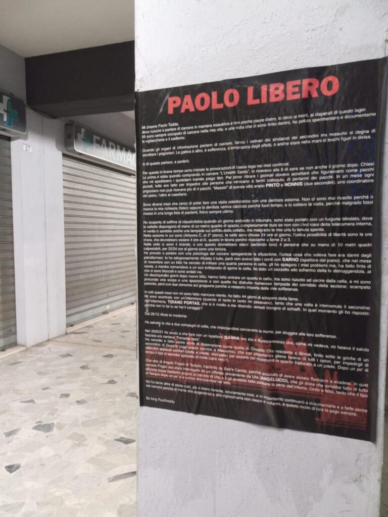 Paolo e’ ancora in carcerePaolo e’ ancora vittima di soprusiPaolo e’ ancora forte e lotta per sè stesso e per tutti i prigionieriContinuiamo a stargli vicinoContinuiamo a scrivergliContinuiamo a far girare le sue lettere Per un mondo senza galerePer un mondo senza sfruttatiLiberta’ per tutti e tutte Paolo Todde,C.C. “E. Scalas”, Zona Industriale Macchiareddu 19,09123 Uta (CA)