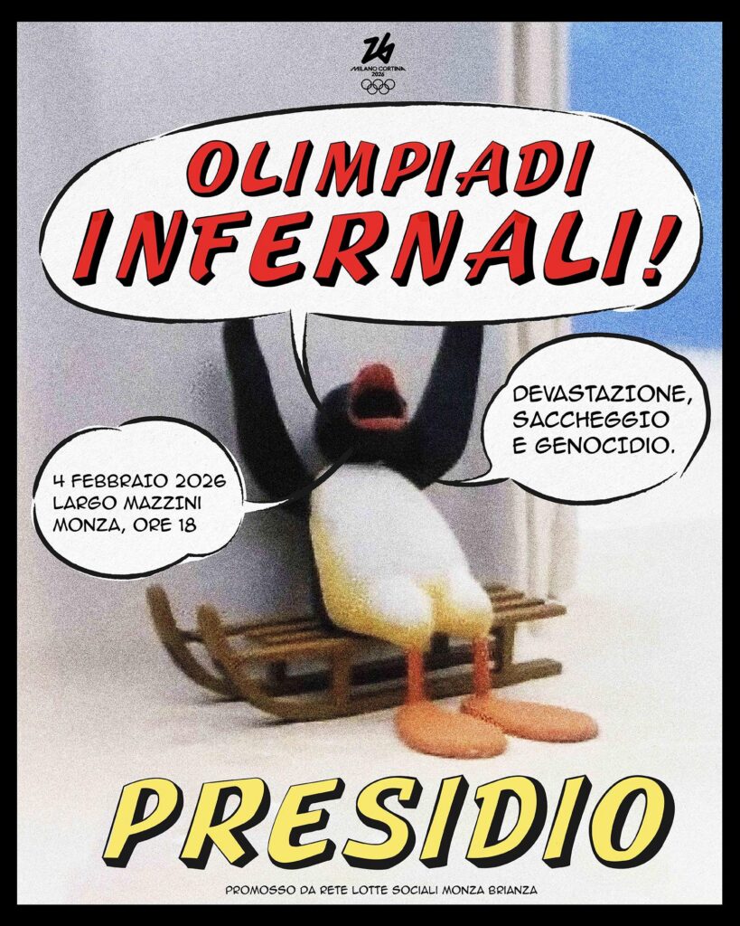 Mercoledì 4 febbraio 2026 Ore 18, Monza, Largo Mazzini, Presidio Milano – Cortina OLIMPIADI INFERNALI Devastazione, sfruttamento, genocidio. Mercoledì 4 febbraio la fiaccola olimpica giunge a Monza: istituzioni, sponsor e un lungo elenco di utili idioti si preparano a celebrare il carrozzone mediatico. In uno spettacolo strapieno di retorica, l’immaginario sportivo è strumentalizzato per celare il vero volto del grande evento. MILANO CORTINA É SPECULAZIONE E DEVASTAZIONE AMBIENTALE Le zone montane interessate dall’evento hanno subito un attacco pesantissimo: taglio di ampie zone boschive, cementificazione di aree verdi, interventi invasivi a supporto di attività non più compatibili con i cambiamenti climatici […]