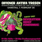 *English translation below* FLINTA* ONLY (Frauen, Lesben, intergeschlechtliche, nicht-binäre, trans und agender* Personen) Samstag, 07.02.2026 | ab 19:00 Uhr | Bandito Rosso*, Lottumstraße 10a, 10119 Berlin REVOLUTION HEIẞT FEMINISMUS! Um 20 Uhr gibt es ein 60 minütiges Podiumsgespräch zum Thema Revolution. Im Anschluss können Fragen gestellt und Anmerkungen gemacht werden. Das Gespräch findet auf deutsch statt, Flüsterübersetzung bitte vorzeitig anfragen. Außerdem: – warmes veganes Essen – kalte Getränke – Tischkicker – Sticker *nicht barrierearm (Treppe mit 7 Stufen am Eingang: Außen-Klingel betätigen, wenn ihr Unterstützung braucht!; einzelne Stufen im Innen-Bereich; Holzstühle mit Rückenlehne; abgetrennter Rauch-Raum, Rückzugs-Raum) *English* OPEN […]