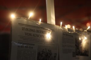 Um den Opfern des Holocausts zu gedenken, haben wir gestern, 81 Jahren nachdem das Konzentrationslager Auschwitz von der Roten Armee befreit wurde, gemeinsam mit der VVN BdA vor der Münze 13, dem ehemaligen Gestapo-Revier, eine Kundgebung abgehalten. Das Gedenken begannen wir mit einer Rede, in der wir beschrieben, wie der Antisemitismus ein „zentrales ideologische(s) Fundamente war, um die Herrschaft der Kapitalisten zu sichern“ und wie die Nazis Jüdinnen und Juden verantwortlich für die schweren Krise des Kapitalismus machten, während es stattdessen „die räuberischsten und reaktionärsten Teile des deutschen Finanzkapitals (waren) die eine großes Interesse an der Machtergreifung der Nazis hatten“.