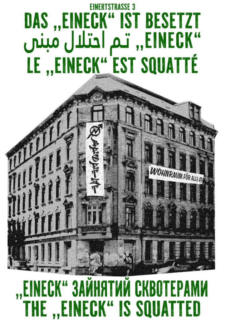 Leipzig Besetzen hat das Eineck besetzt: https://leipzigbesetzen.noblogs.org/post/2025/10/15/eineck-neue-hausbesetzung-im-leipziger-osten/ Die autonomen Besetzungstage in Leipzig gehen weiter! Wir, Leipzig Besetzen, haben uns dem Aufruf der Autonomen Besetzungstage angeschlossen und heute, am 15. Oktober, ein Haus besetzt! Das Eckhaus in der Einertstraße 3 heißt jetzt Eineck. Wir laden alle Menschen ein, zur Besetzung zu kommen. Luwi, Tiefe, Antischocke, Helium: Die Besetzungen der letzten Jahre im Leipziger Osten haben es gezeigt: die Stadt, Hauseigentümer*innen, und die Bullen haben keinerlei Interesse daran, uns unsere Freiräume zu lassen. Statt genutzt zu werden, sollen leerstehende Häuser lieber weiter verfallen und die, die was dagegen haben, werden mit Schlagstöcken […]
