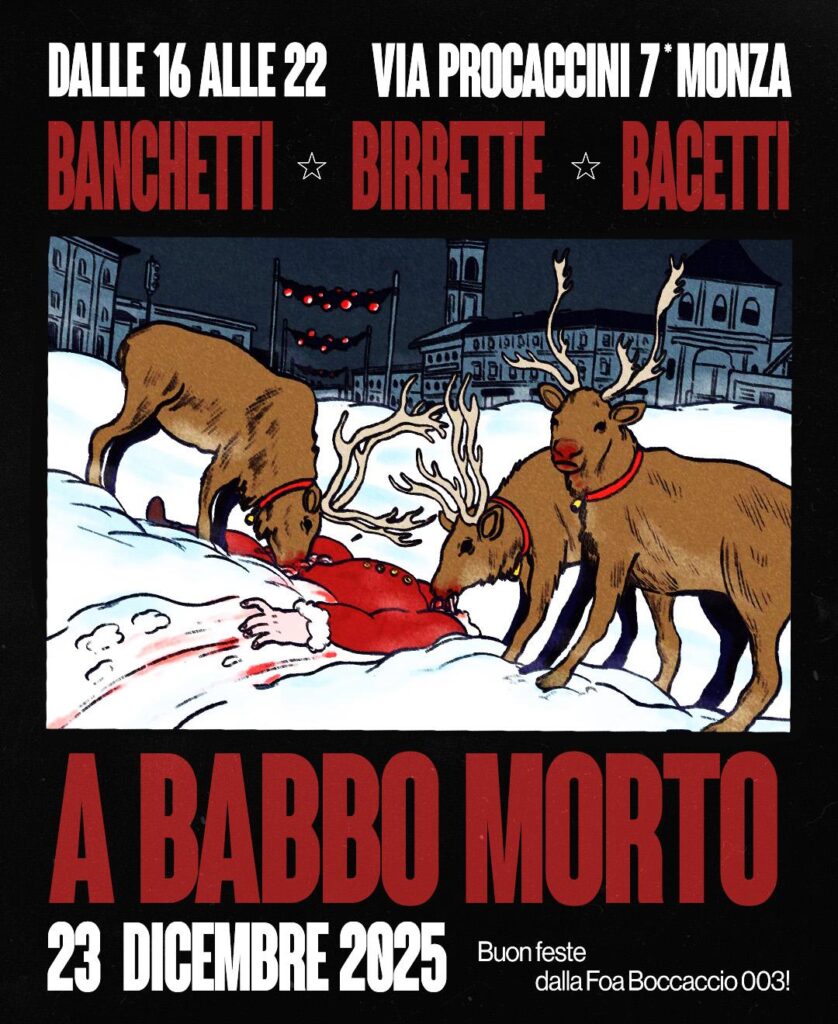 Martedì 23 dicembre 2025 in via Procaccini 7, Monza Dalle ore 16 alle ore 22 La FOA Boccaccio presenta: A BABBO MORTO.Banchetti di autoproduzioni, musica e vin brulé. Come da tradizione, l’occasione per stare insieme in piazza, mangiare e bere, rafforzando relazioni autentiche, lontano da luminarie e mercatini di plastica. Ingresso libero