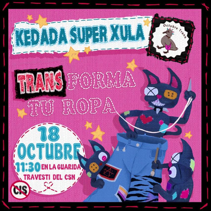 hola xikeeeees!!!! estamos muymuymuy felices de sakar xfin el kartel de la kedada super xula pa trans(🤪)formar ropita, aunke en verdad es un poko una exkusa pa almorzar, eskuxar musikita ooo simplemente pasar el rato….. todo en kompañia de nuestres travestis de konfianza 🥳🥳🥳🥳 la kedada será el próximo sábado 18 en la guarida del CSOA CSN (c/cadirers 2), de 11:30h a 14:30h ooo hasta ke se nos duerman las manos de tanto koser. si algune no sabe llegar al sitio ke nos eskriba!!! ese dia prohibido ser cis❌❌❌❌ será un espacio no-mixto y 0 tolerante ante kualkier aktitud racista, […]