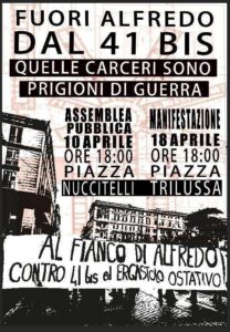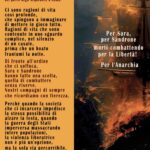 “Plus forts que la mort”. Messaggi murali per Sara e Sandro (Saint-Etienne, Francia) Due compagni anarchici, Sara e Sandro, sono morti recentemente a Roma mentre lottavano in questa guerra sociale. Fino all’ultimo istante della loro vita hanno dato prova del loro impegno rivoluzionario. La loro abnegazione ci ispira e il nostro dolore, lungi dall’abbatterci, ci darà la forza di continuare la lotta anarchica per la libertà, contro ogni forma di dominio. La stampa al servizio dello Stato sta cercando di fomentare un panico morale riguardo all’uso di un ordigno esplosivo da parte dei nostri compagni. Questi scagnozzi dello Stato sostengono […]