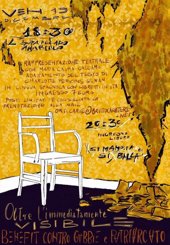 Diffondiamo: Venerdì 19 dicembre ore 18.30 Via Fastuca 2 (Palermo) “EL EMPAPELADO AMARILLO” (La carta gialla) – Rappresentazione teatrale con Maria Laura Caccamo. Adattamento del testo di Charlotte Perkins Gilman. Regia di Carlos Lipsic. In lingua spagnola con libretto in italiano. Ingresso 7 euro posti limitati, si consiglia la prenotazione via mail: orticarie@bruttocarattere.net Prenotazioni via Tel: 3278939439 338 7329206 dalle ore 20:30 ingresso libero, si mangia e si balla Il carcere esiste soprattutto per fare paura, e spesso ci riesce. Le galere stanno lì per terrorizzare e annichilire non solo chi è dentro, ma anche chi resta fuori. In questo […]