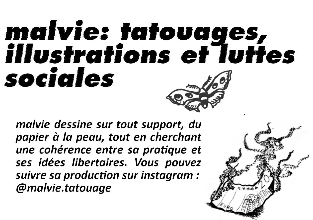 extrait de l’apériodique coutoentrelesdents n°1 disponible gratuitement → ici ← Salut est ce que tu peux te présenter? J’ai grandi à la campagne, mais j’aime quand il y a beaucoup de monde. Ça fait une quinzaine d’années que je vis en ville, et ça m’a permis de traîner dans des squats politiques, où j’ai appris à tatouer grâce à des copain.e.s, sur elleux-mêmes. J’essaie d’accompagner les luttes émancipatrices et de parler d’elles à travers n’importe quelle technique graphique. Le tatouage m’a donné ce qu’il me manquait dans le dessin : le côté ça vit, ça se transforme, ça devient quelqu’un. […]