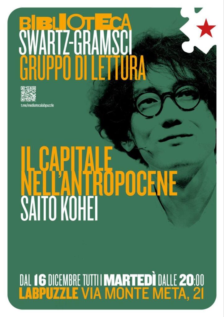 Biblioteca Swartz GRAMSCI 🫂GRUPPO DI LETTURA! 🗓️Da Martedì 16 Dicembre ed ogni martedì 20:00 si riunisce il gruppo di lettura della biblio Swartz 🥳 📚 Il primo libro scelto è “Il capitale nell’Antropocene” di Saito Kohei,un manifesto di critica al tecno-utopismo e ai greenwashing di stato. Tra Marx e teorie della decrescita ci propone alternative per salvarci dalla crisi climatica e da quella sociale. 👀Dicono di lui “Il libro di economia piú eversivo del decennio”. 👉🏼Il 16 Dicembre ci facciamo una chiacchiera, introdurremo il testo e proietteremo un intervista dell’autore…dai martedì successivi inizieremo con i primi capitoli