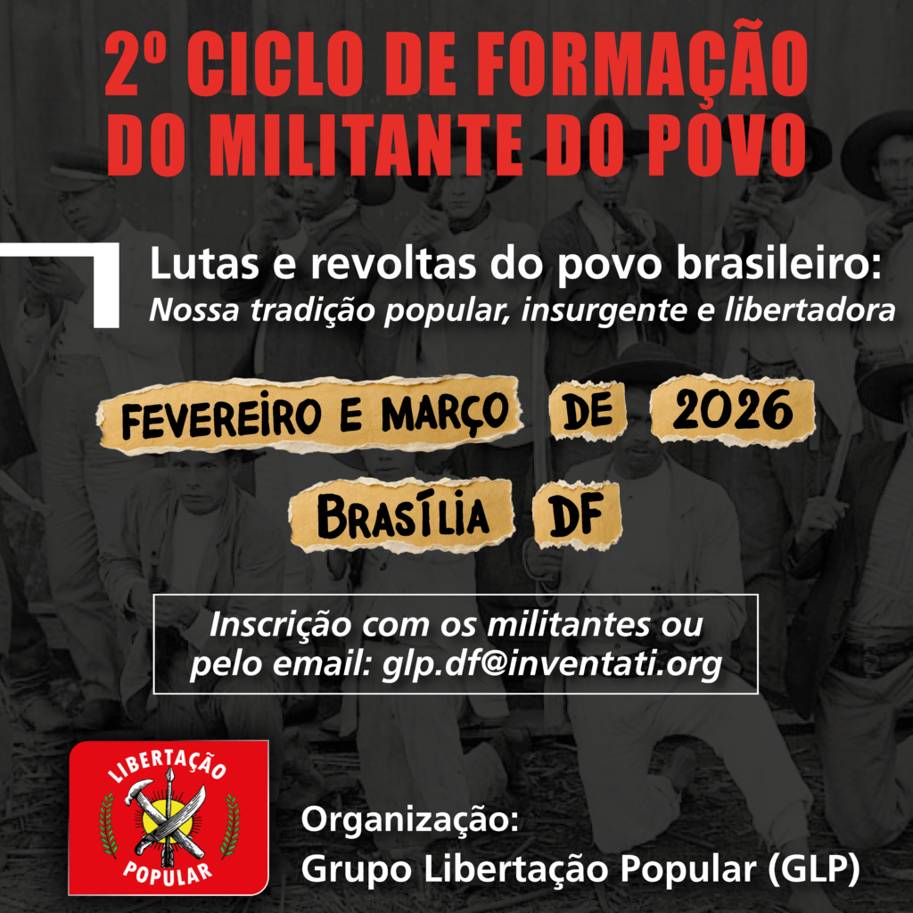 O Grupo Libertação Popular convida para o 2º Ciclo de Formação Básica do Militante do Povo, que acontecerá em Brasília (DF), na sede da CSP-Conlutas (SCS, Qd. 3, Ed. Planalto, Bloco A, sala 106), sempre aos sábados, a partir das 9h da manhã nas seguintes datas: 28/02, 14/03 e 28/03. Iniciaremos cada formação com um Café da Manhã para os participantes, apresentação das pautas e organização da atividade. Abordaremos em nossos encontros a temática: Lutas e revoltas do povo brasileiro. A formação tem o objetivo de auxiliar jovens, adultos, estudantes, trabalhadores e trabalhadoras a compreender o povo brasileiro como sujeito histórico; a valorizar as experiências coletivas de resistência; a […]